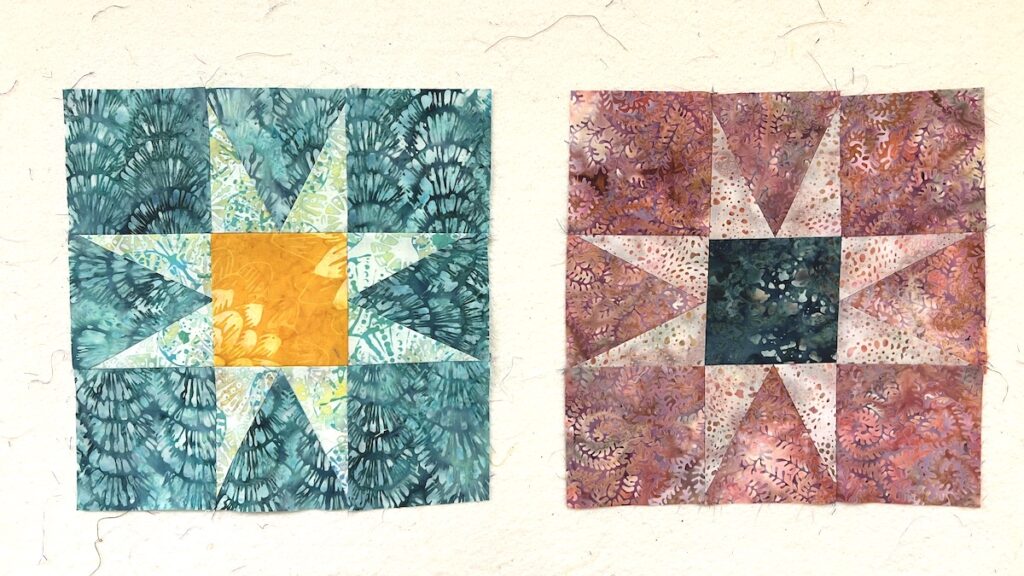 The finished block is smaller than the earlier ones in the quilt. That size difference is intentional and will be resolved with sashing and mini nine-patch units as the quilt grows outward. Each 8-point star block should measure 9-1/2″ square (unfinished).